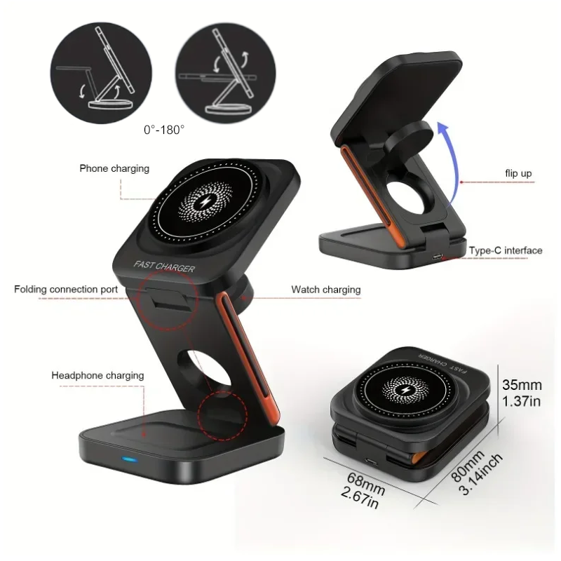 ➤ Its lightweight, foldable design makes it perfect for travel, doubling as a phone stand for calls or streaming on the go. With strong magnetic alignment for effortless snap-on charging and built-in safety features to protect against overheating, surges, and camera lens damage, this sleek dock keeps your essentials powered, organized, and always ready.