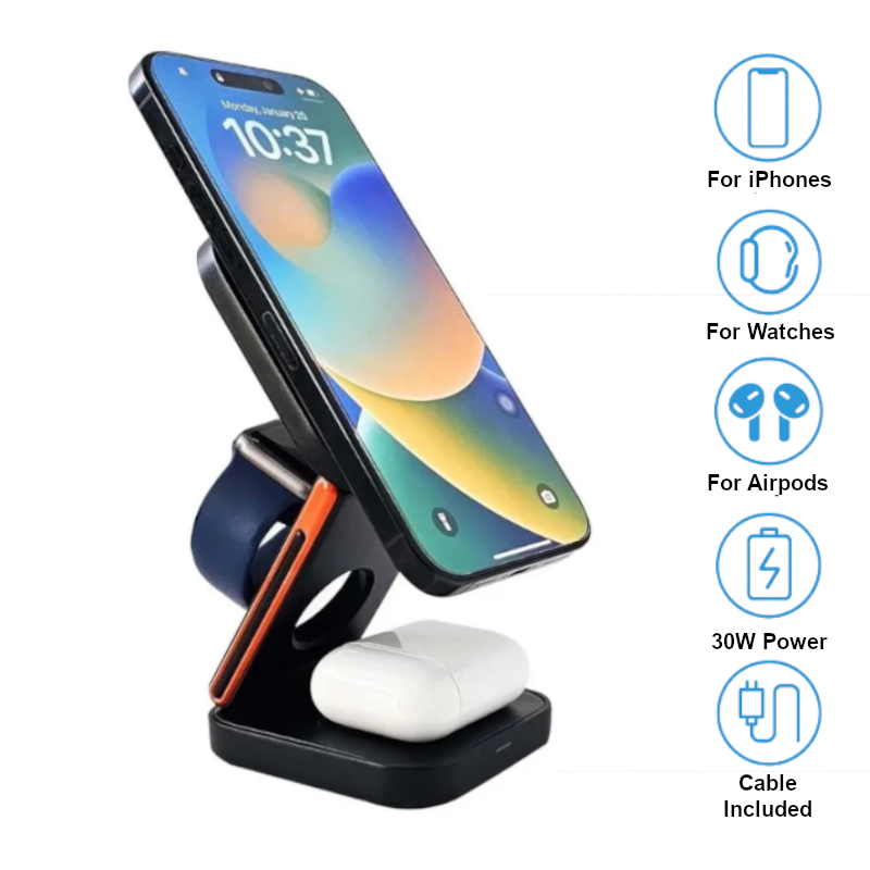 ➤Say goodbye to tangled cords and juggling multiple chargers. The 3-in-1 Magnetic Wireless Charger is the ultimate all-in-one solution to keep your iPhone, Apple Watch, and AirPods fully powered — whether at home, in the office, or on the go.
